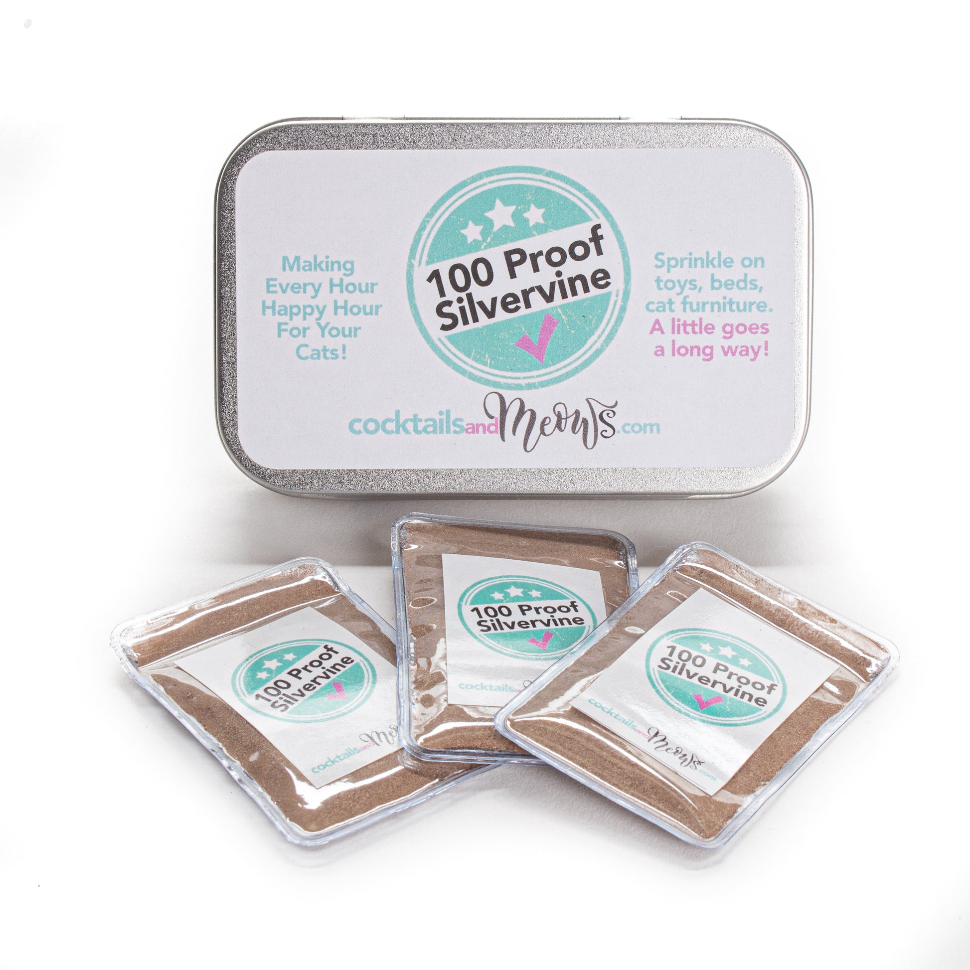 Keep your cat's favorite spaces irresistibly fresh with our food grade 100 Proof Silvervine in this reusable tin. Three resealable pouches packed with potent aroma perfect for refreshing toys, beds, mats and cat trees. Wherever you sprinkle it, cats can't resist the inviting scent and enriching play it inspires. Remember a little goes a long way... so sprinkle sparingly.