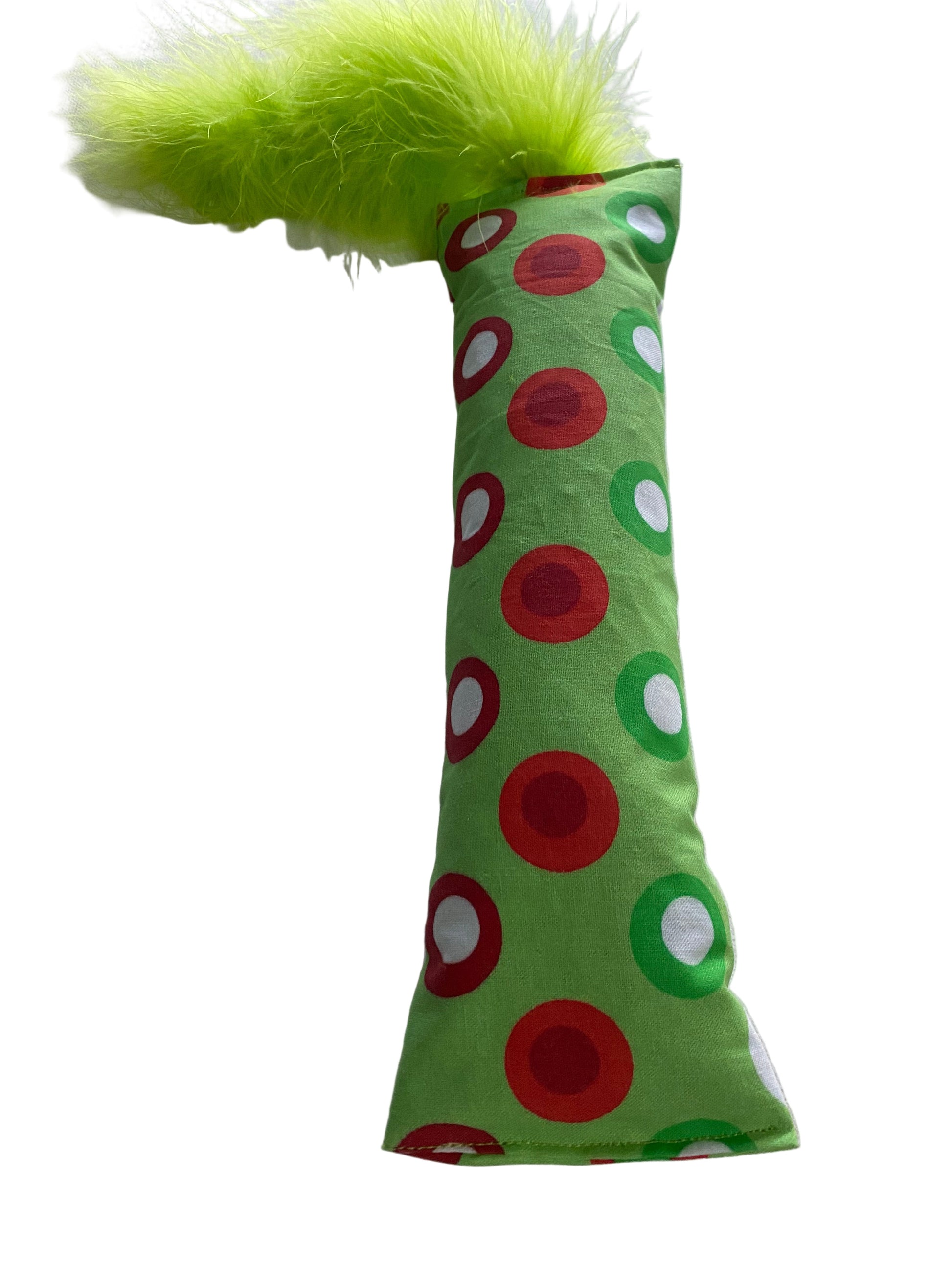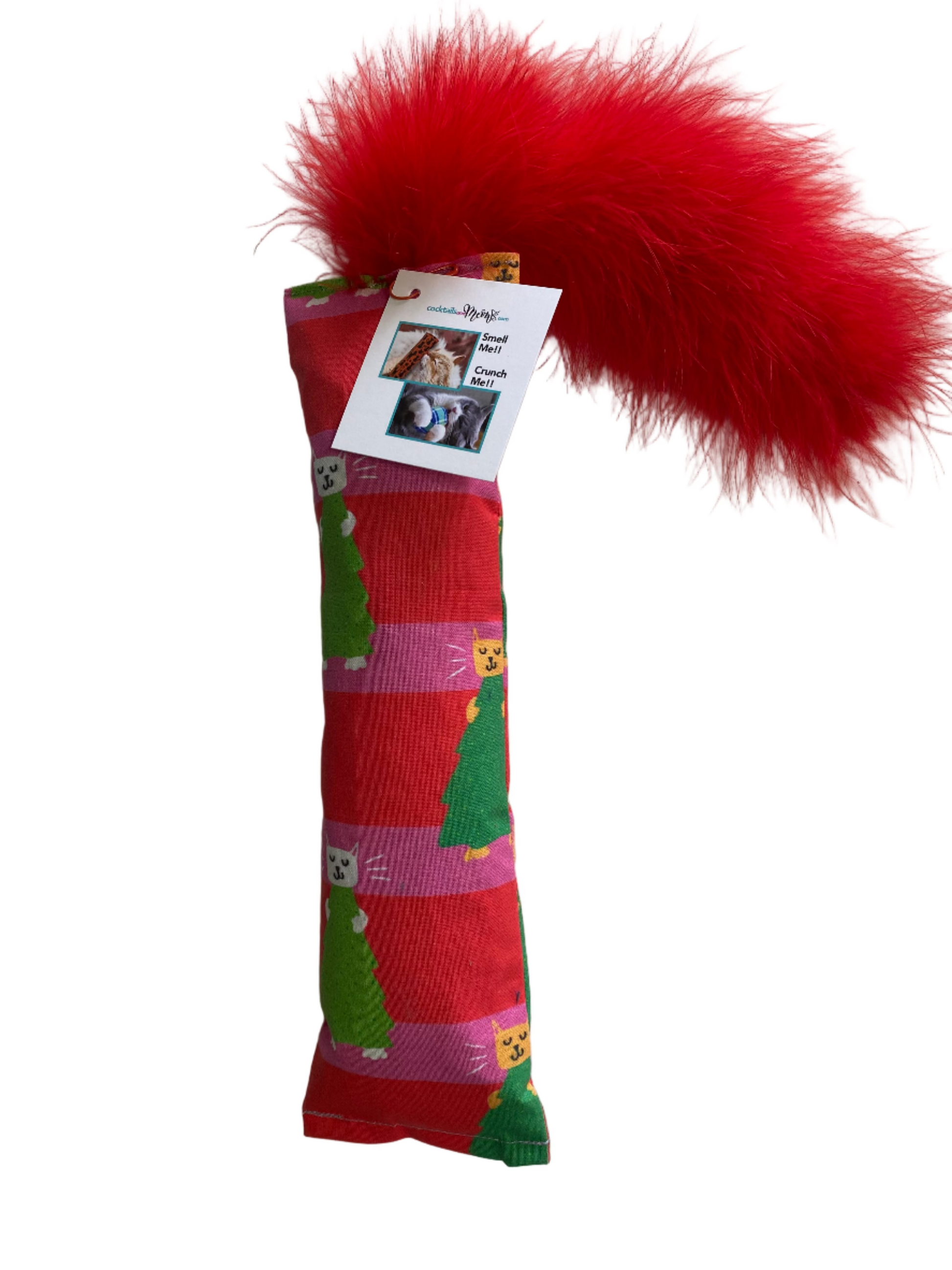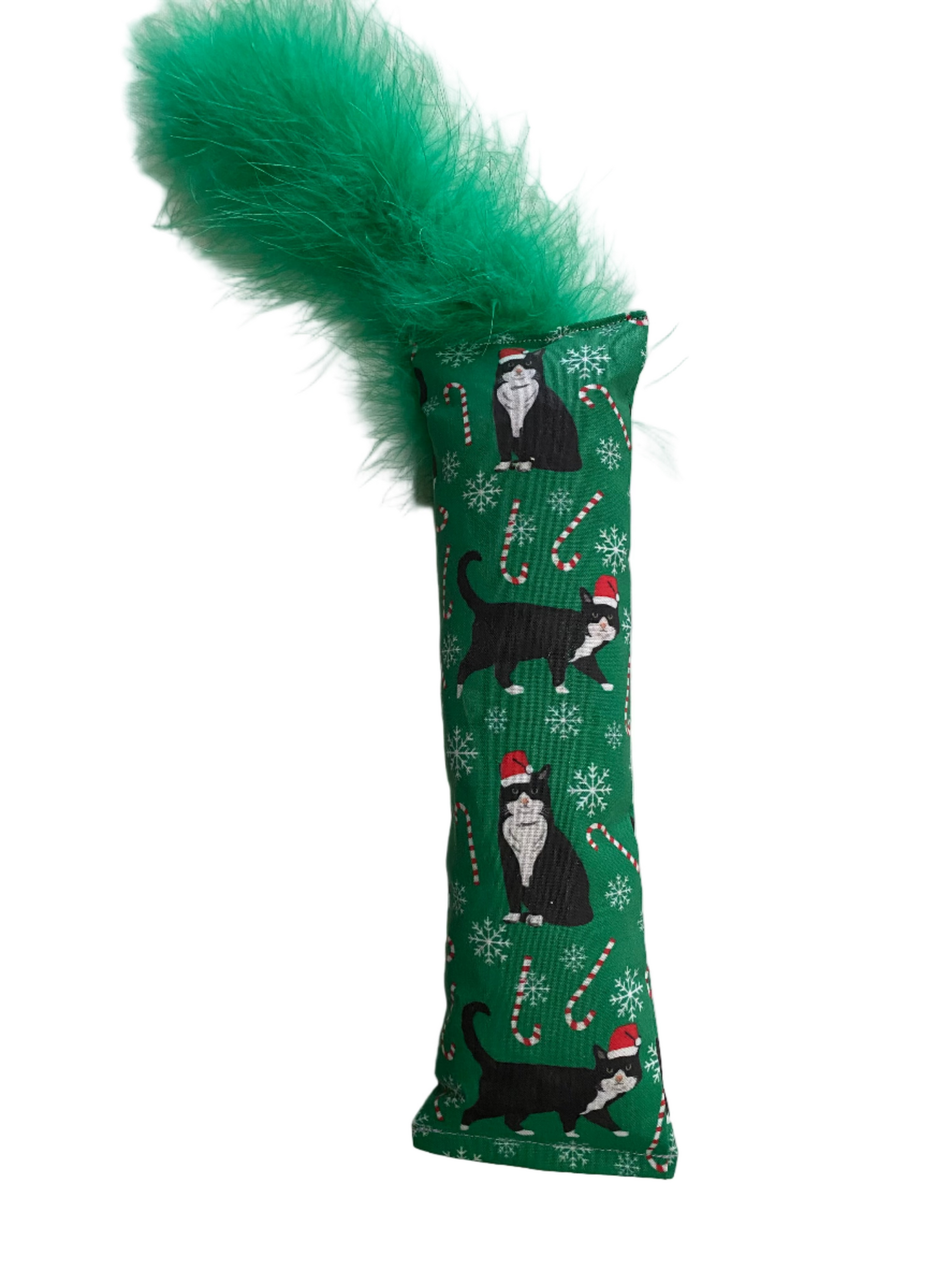 This 10" long toy, plus 4" of feathers, is pure kicking bliss, stuffed to the brim with irresistible crunch and our super potent food grade 100 Proof Silvervine & Catnip blend. Handmade and fresh-filled to order in a fabulous holiday themed prints.